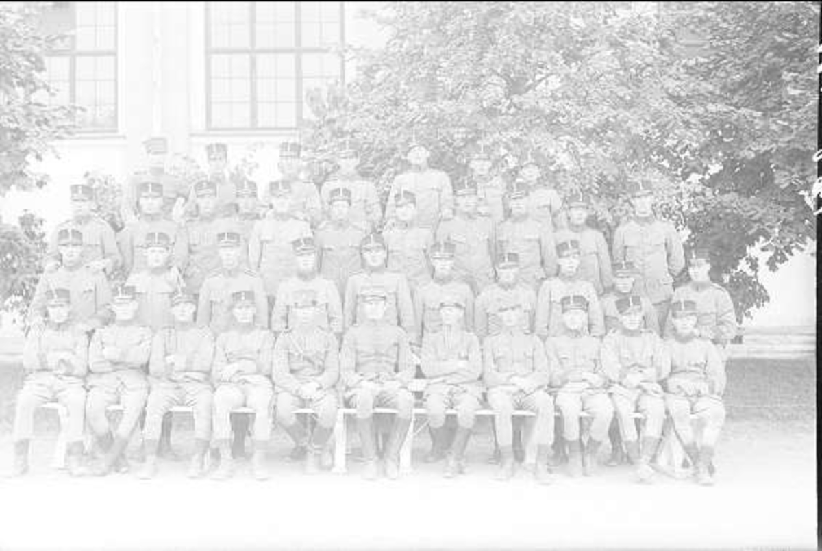 Värnspliktstropp med sitt befäl. Befäl och underbefäl i uniform m/1923, de värnpliktiga i uniform m/1910 och mössa m/ä.