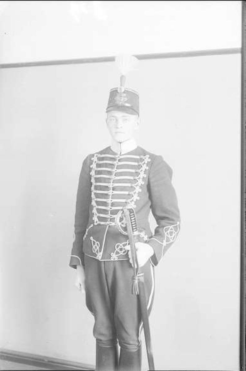 Livhusar i paraduniform m/1895 (m/ä) med mössa m/1853 med plym och sabel m/1893 med lång sabelhandrem.