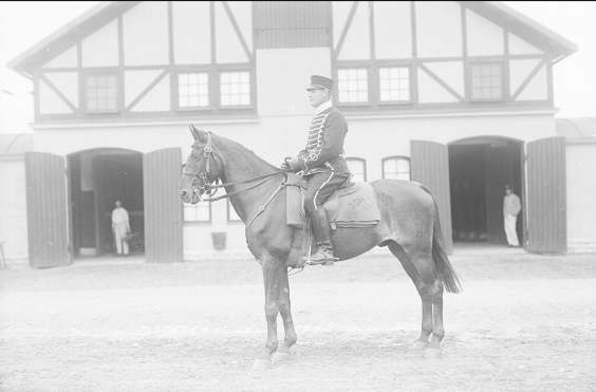 Livhusar på tilldelad stamhäst utanför skvadronstallet.
