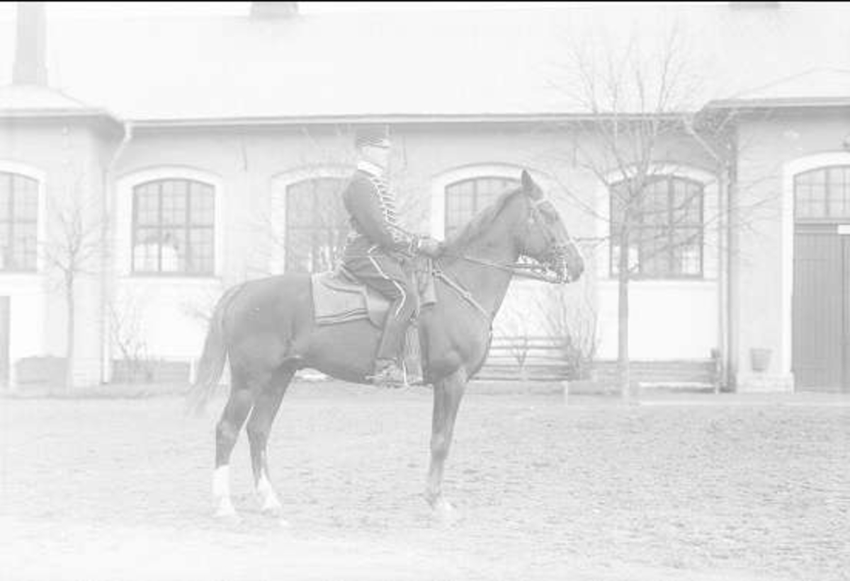 Livhusar på tilldelad stamhäst utanför skvadronstallet.