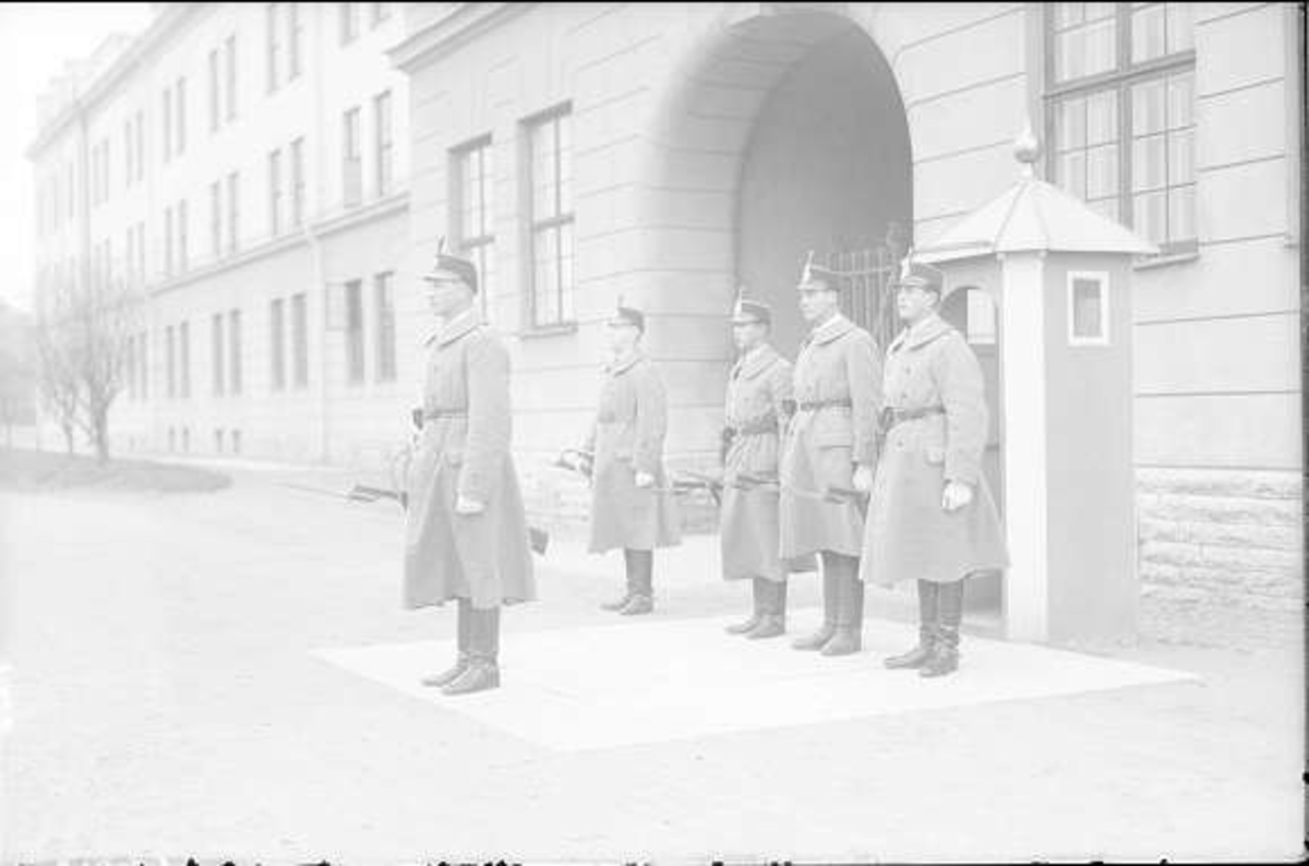 Kasernvakten uppställd på poststället utanför valvet K3. Klädsel: mössa m/1853, uniform m/1895, kappa m/10.
