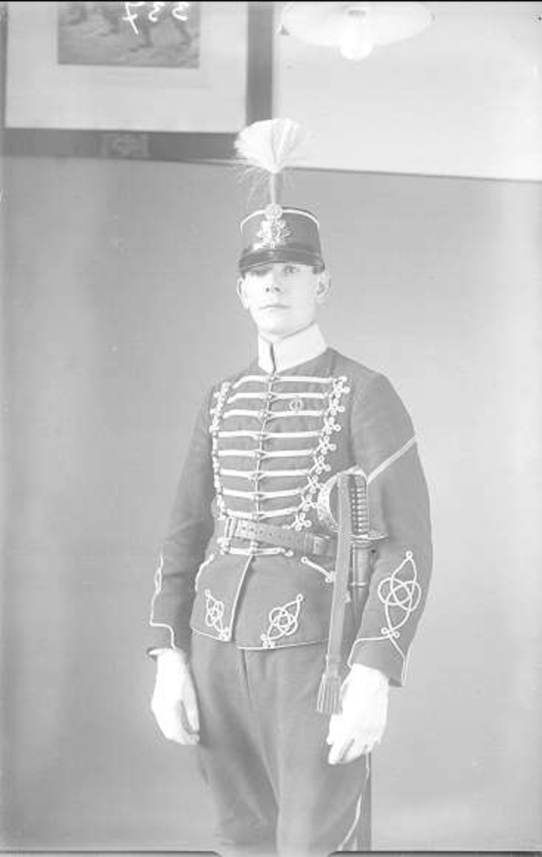 Livhusar i paraduniform m/1895 (m/ä), mössa m/1853 med plym, kavallerisabel m/1893.