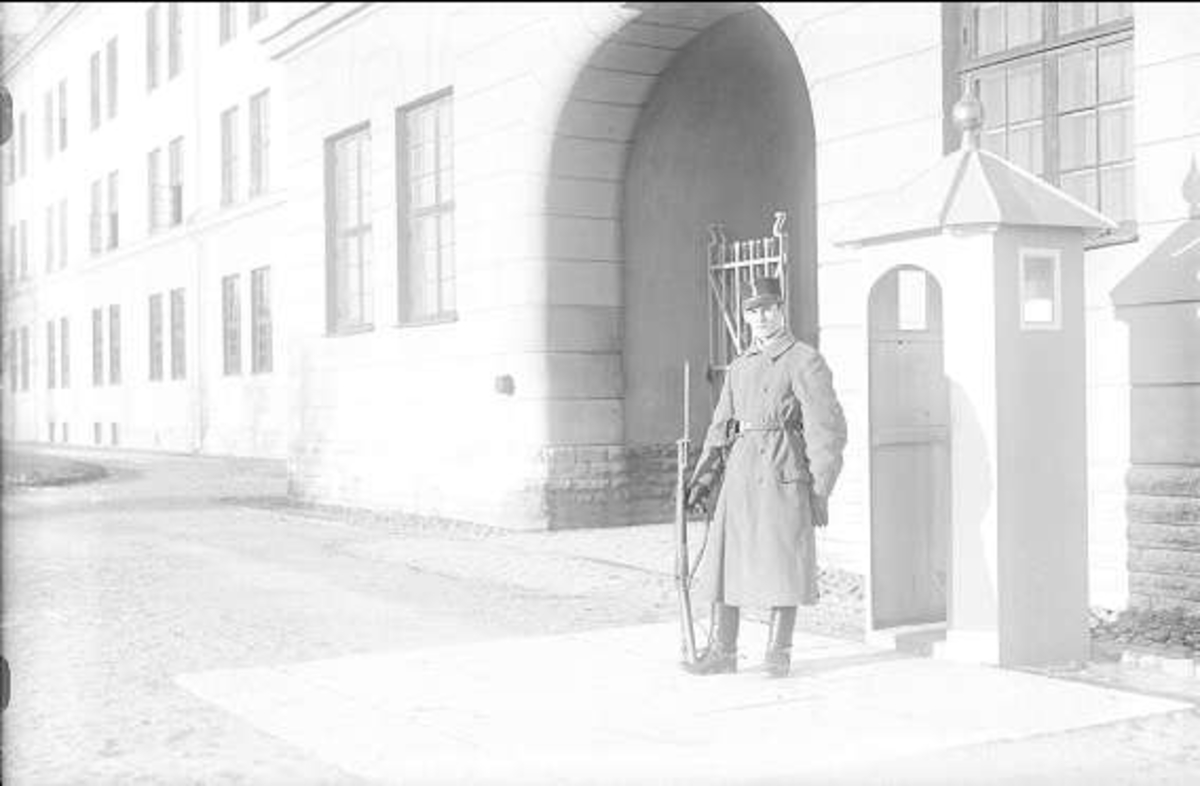 Vakt på poststället utanför valvet K3. Uniform m/ä och kappa m/10.