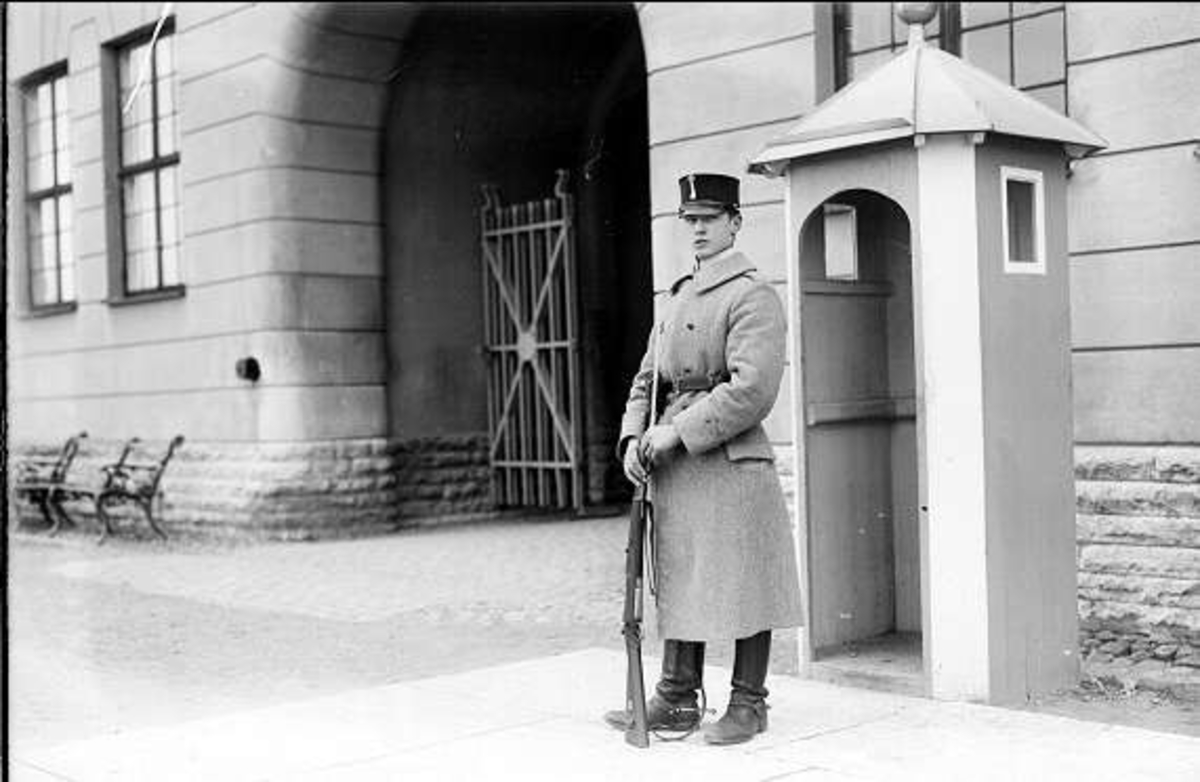 Vakt på poststället utanför valvet K3. Uniform m/ä och kappa m/10.