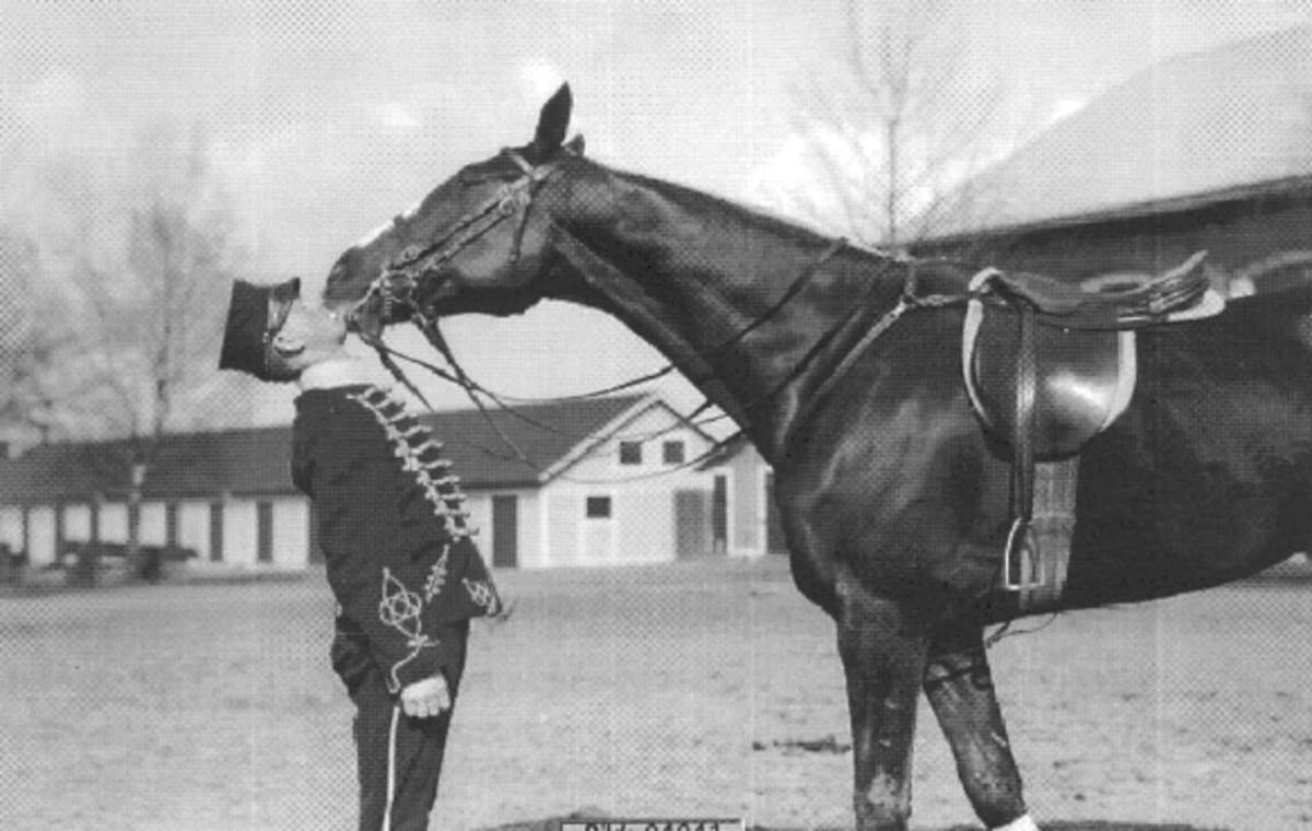 K3. Hästskötare under "frihetsdressyr" med officers tjänstehäst. "Ta socker-biten fint från mina läppar!"