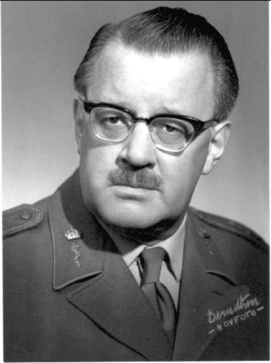 Porträtt av Hugo Forsgren, bataljonsläkare vid K 3 1948 -56. Text ang Forsgren på baksidan av fotot.