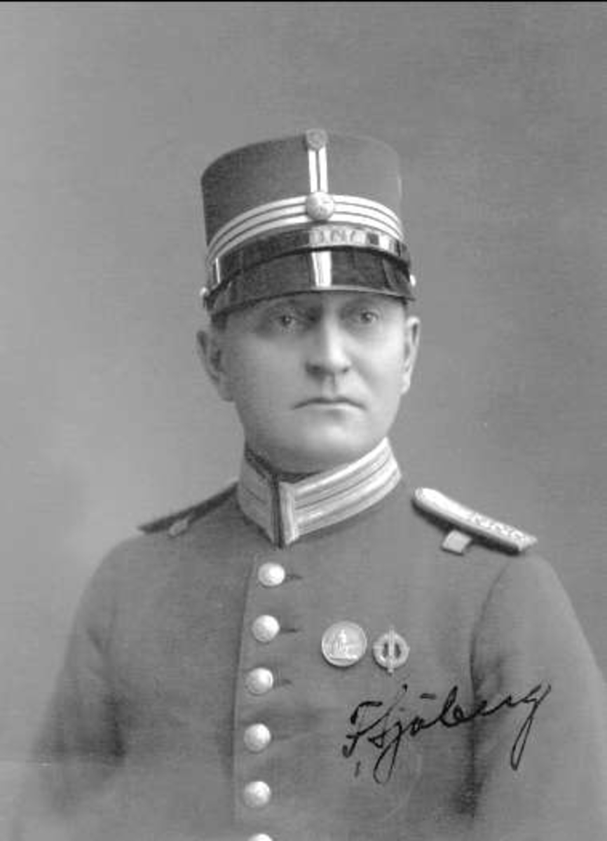 Porträtt av förvaltare F Sjöberg - Regementsintendent K 3. OBS! Kaptens gradbeteckning men underofficersknapp i mössan - alltså antagligen ej regementsintendent, utan intendenturförvaltare.