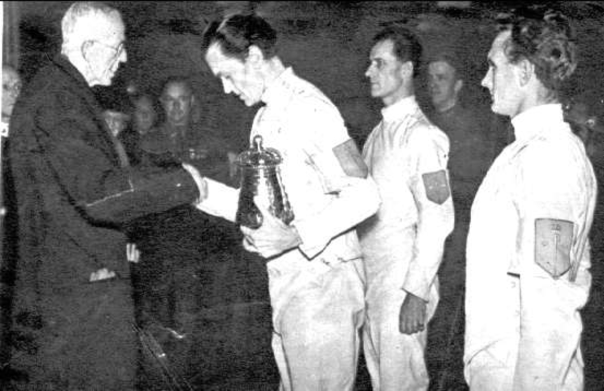 Palmstjerna, Wachtmeister och Linton, segrande lag i värjfäktning om " Kungens kanna", tar emot priset av Kung Gustaf V.