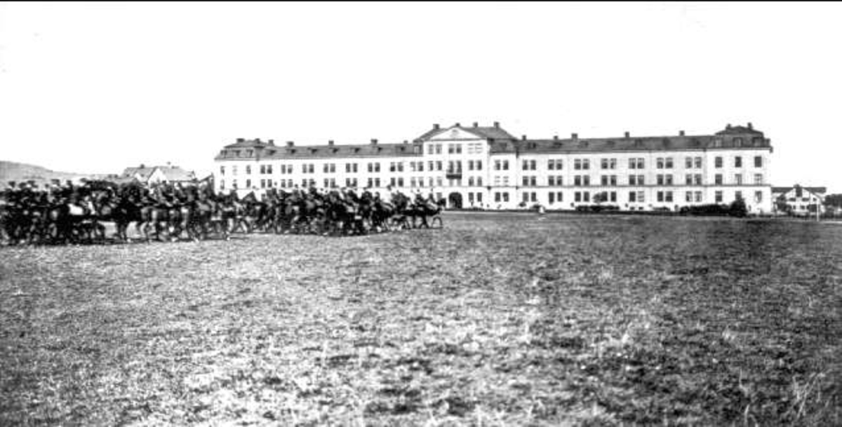 K 3 kasern i Skövde från söder. I förgrunden "skvadronsexercis" till häst.