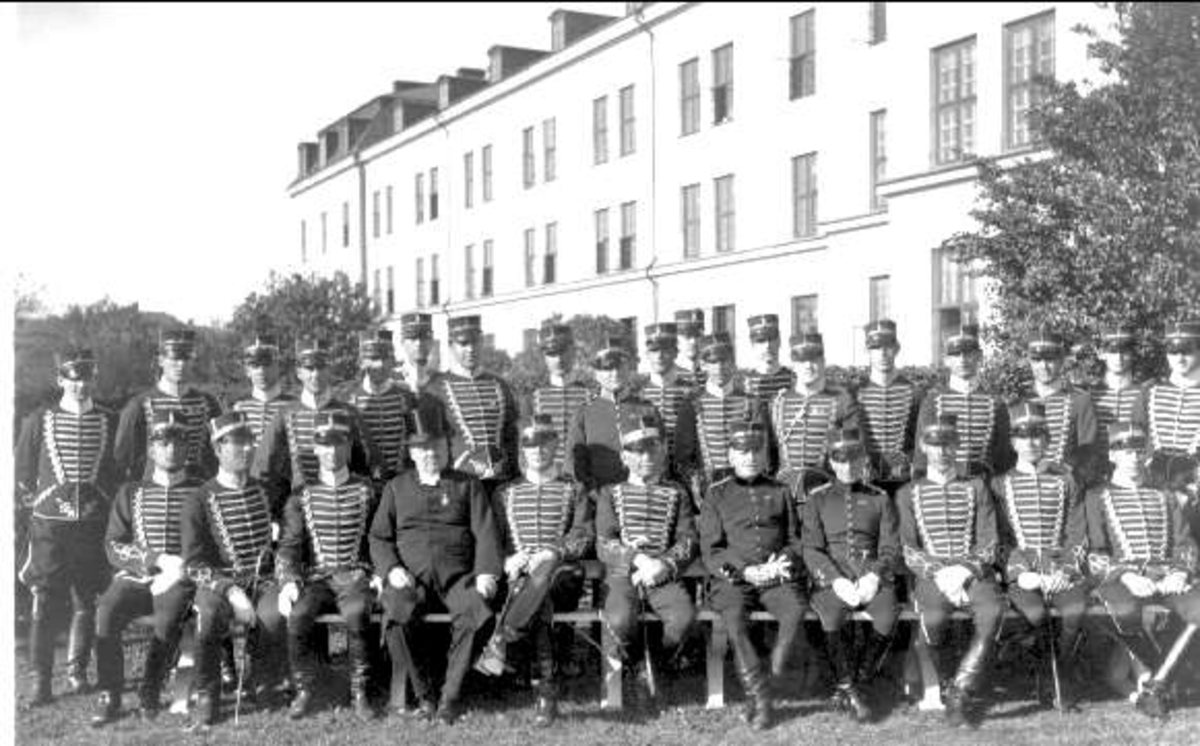 Officerskåren söder kasernbyggnaden. Sekundchefen i mitten troligen överste Arnström. Två steg till höger om sekundchefen reg.prosten Paul Nilsson, till vänster reg.vet Hellgren.