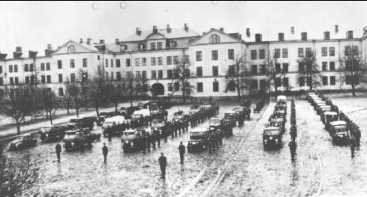 Spaningsskvadron uppställd för avlämning på kaserngåden K 3, före avmarsch till övning.