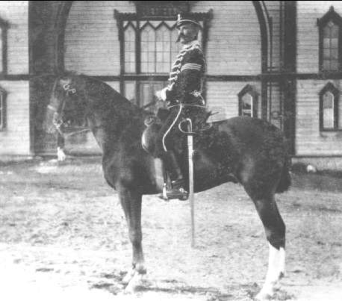 Distinktionskorpral (tresteckad furir) till häst utanför Engellska ridhuset.