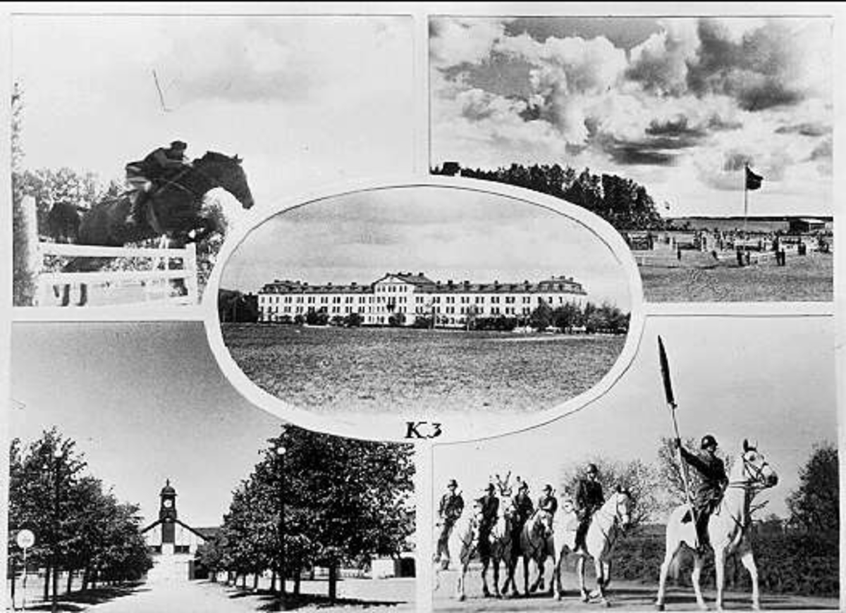 På kortet: Hästhoppning, hinderbanan K 3 Skövde, klockstallet K 3 Skövde, parad med standarförare.