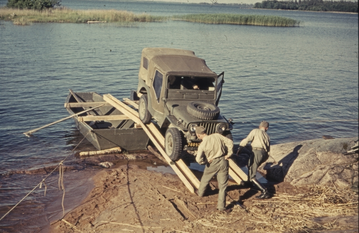 Signaltrupperna, S2 Karlsborg 1957,Jeep-färja demonstreras i samband med Jutan-övningar på Vänern.
