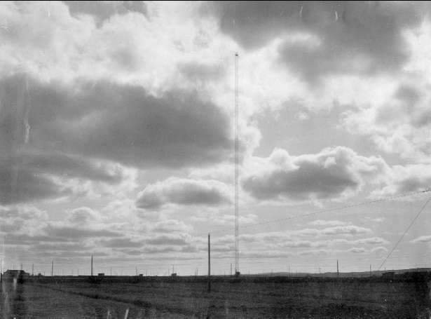 Titel: Karlsborgs radiostation i Kråk. Från mastresningen, år 1916. Masterna är konstruerade av professor K Ljungberg, Stockholm, var 210 m höga och vägde 25 ton. Foto: Alfred Sjöberg, Karlsborg. Masterna revs i mars år 2001.