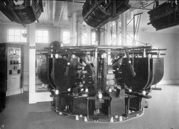 Interiörbild, Karlsborgs radiostation i Kråk. Gnistsändaren, den största som byggts, fanns på Kråk 1917 - 1932. Sändaren var från 1926 - 1932 reserv för Motala rundradio. Den revs för att bli visningsobjekt på telemuseum i Stockholm.