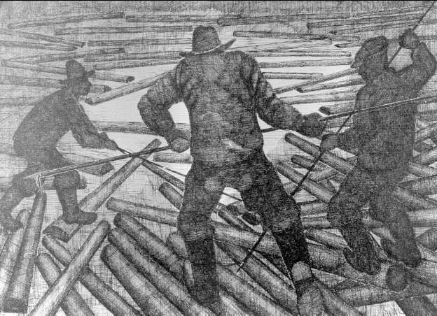 Titel: Utställningen "Skogsbruket förr och nu" år 1984-85. Timmerflottning. Avkopierade bilder från böcker.