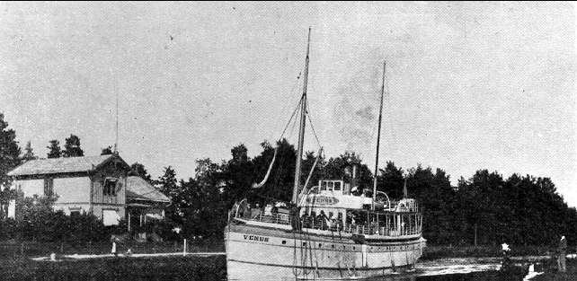 Karlsborg, Göta kanal. Passagerarbåten Venus passerar Kanalholmen.