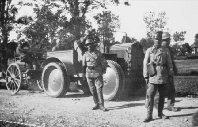 Marsch sept 1930. 7 cm kanon m/30. Battoff L Carlesson (till höger), troppch furir T Schultzén (till vänster). Traktor m/28. Förstoring 25 x 40 cm.