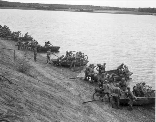 Titel: Överskeppning av cykeltrupp med överskeppningsbåt; 5 á 6 man med utrustning och cyklar i varje båt.
