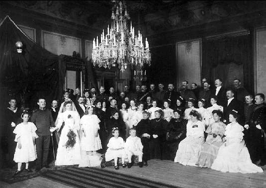 Bröllop i generalsalen 1902. Underofficerkårens (Ing 2) medlemmar med damer.