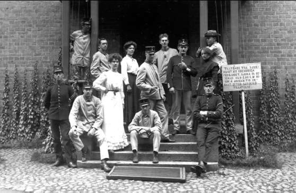 Sjukvårdspersonal, patienter och militärer på trappan till ett av annexen på Garnisonssjukhuset, Karlsborgs fästning.