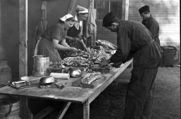 F6 Karlsborg 1952. Eskaderövning i Hultsfred. Förplägnadsinrättningen. Albumet är en del av en donation från Karl-Axel Hansson, Karlsborg. Förteckning över hela donationen finns i albumet samt som Word-dokument.