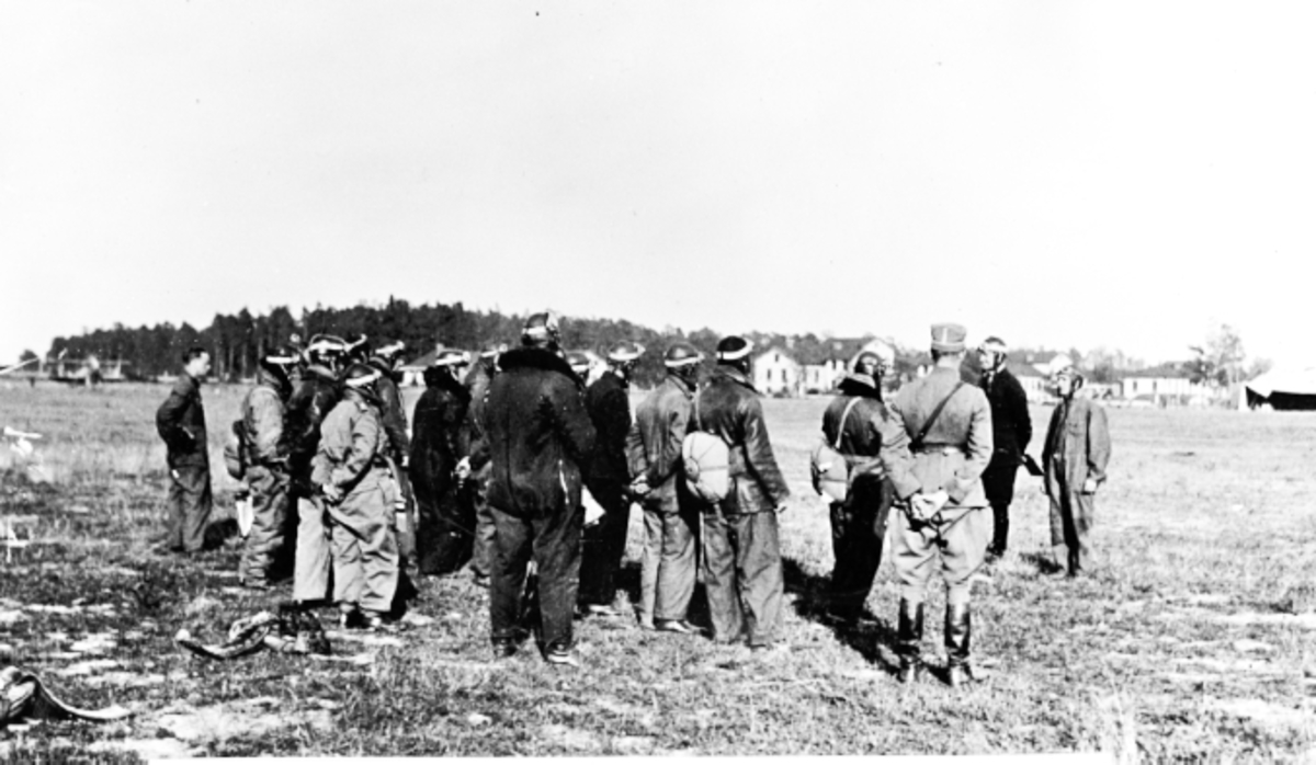 Karlsborg 1936. Ordergivning före flygning. I bakgrunden Iinfanterivolontärskolan.