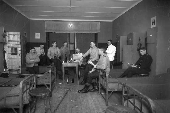 Sjukvårdare på luckan. Dist. Korpral Karl-Emil Scott läser tidningen. Kortet är skänkt av sonen Svante Scott Västerås. Förstoring 16 x 22 cm.