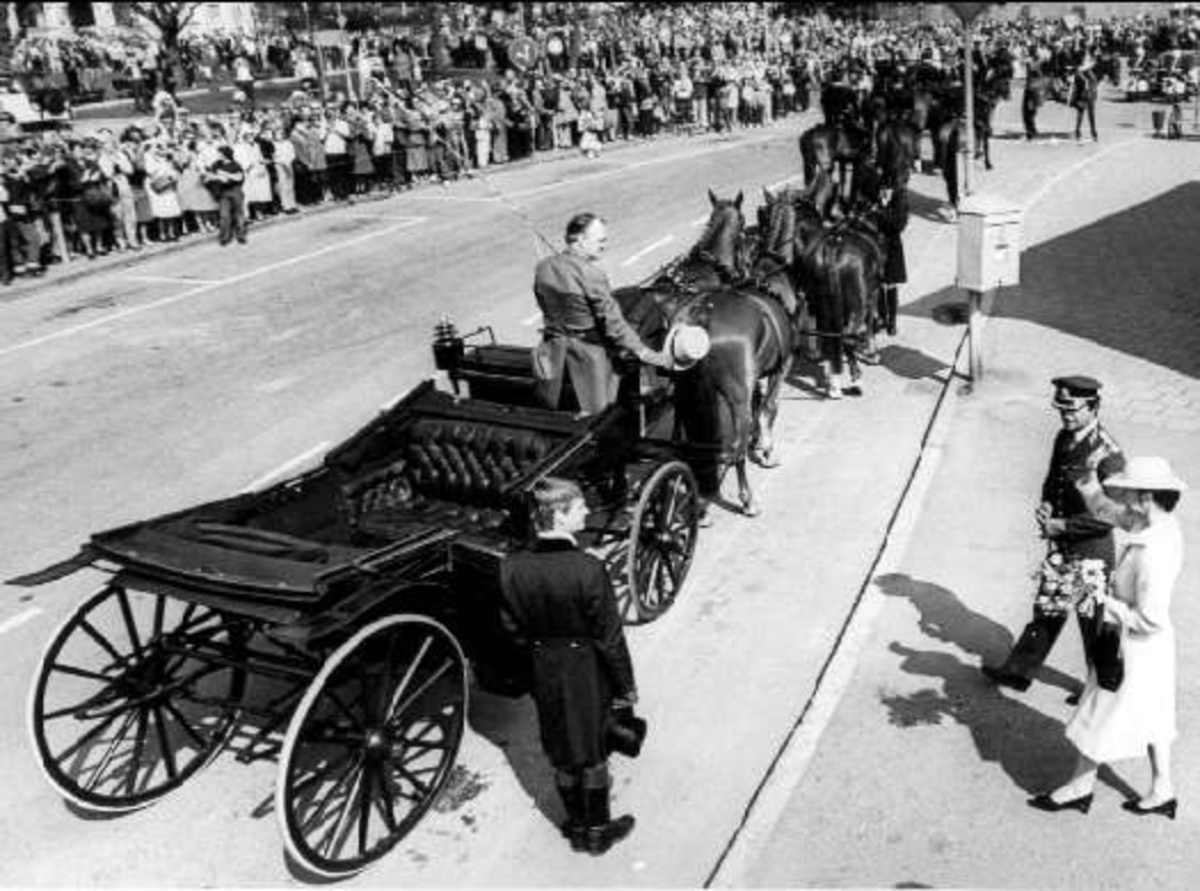 Kungaparets ankomst till P 4 350-års jubileum maj 1981, vid Skövde järnvägsstation. Förridare 6 st K 3-officerare i m/ä. Nils Gyllenswaans fyrspann från Ekeberg, Tidaholm. På kuskbocken ägaren Nils Gyllenswaan.