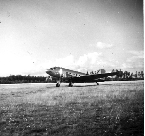 F6 Karlsborg 1952. Flygplan DC3 var den första flygplanstypen som användes vid hoppningar. (Den bevingade hästen Pegasus är målad vid nosen på planet. Albumet är en del av en donation från Karl-Axel Hansson, Karlsborg. Förteckning över hela donationen finns i albumet samt som Word-dokument.