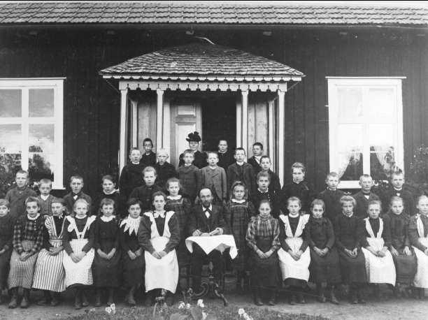 Undenäs, Lindhult skola omkr 1900. Lärare C J Karlsson och skolklass utanför skolhuset. Förstoring 29 x 40 cm. Neg finns.