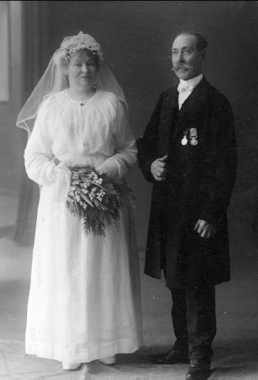 Karlsborg. Brudpar, kyrkovaktmästare Emil Öberg med hustru Matilda. Gåva av David Johansson, Mellangatan 43 Karlsborg. Neg finns.