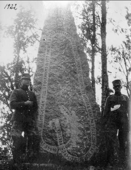 Minnessten över bondetåget 1914, rest i Västergötland.Står på en kulle, på vänster sida, strax efter Tunarps Säteri, riktning Sandhem.