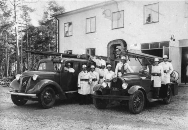 Karlsborg, brandmän och brandbilar framför gamla brandstationen på Västra Vägen (nuvarande polisstation). Brandchefen, målamästare Larsson, syns längst fram till vänster. Neg finns.