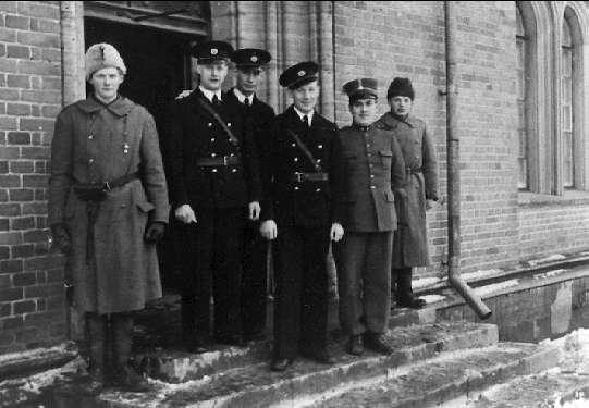 Fästningen, trappan till bankvalvet i slutvärnet år 1942. Tjänstemän från riksbanken samt vakter från regementet, tvåa från höger, Torsten Hall. Förstoringar 21 x 29 och 29 x 40 cm. Neg finns.