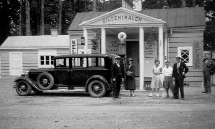 Bilcentralen (Texaco) södra torget, var gemensam bilstation för alla taxiägare i Karlsborg. Närmast bilen Georg Fallander med Malbergs från Mölndal. Fotot taget 1932. Neg finns.