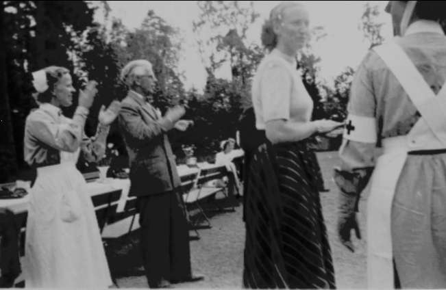 Garnisonssjukhuset, fest i sjukhusparken, från vänster Inga-Lisa Sabe och doktor Lennerfelt. Neg finns. Gåva av Roger Agartsson.