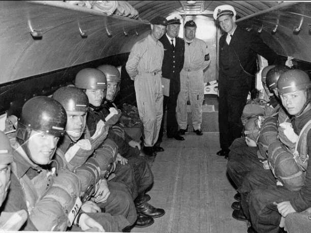 Karlsborg, FJS. Fallskärmsjägare och besättning på DC 3:an, år 1957.