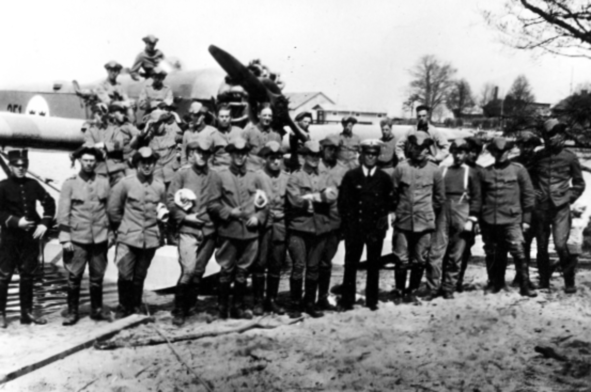 Karlsborg i början av 1930-talet. Karlsborgaren Bjerke längst till vänster tillsammans med en A9-grupp. Förare på flygplanet (S5) är C.G. Karlsson.