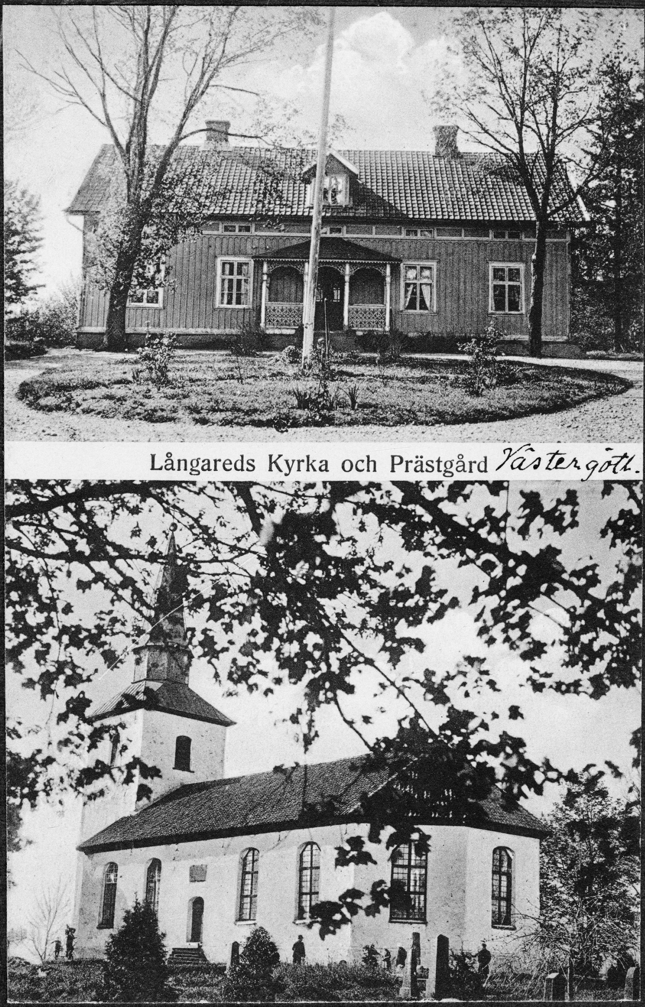 Kyrkan från sydöst, samt prästgården. Vykort.