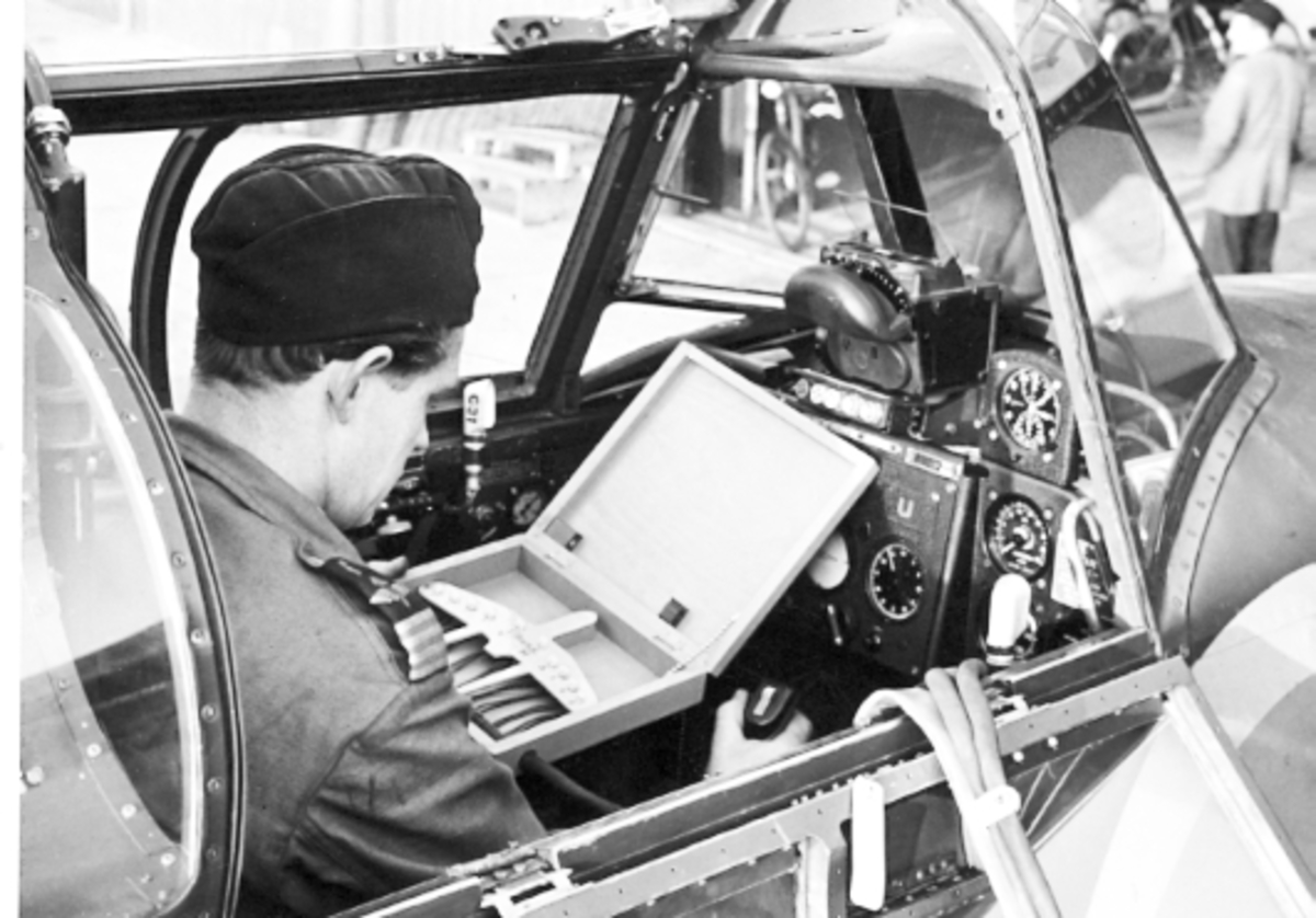 F6 Karlsborg 1949. Tekniker Morgan Olsson testar vapeninstallation.