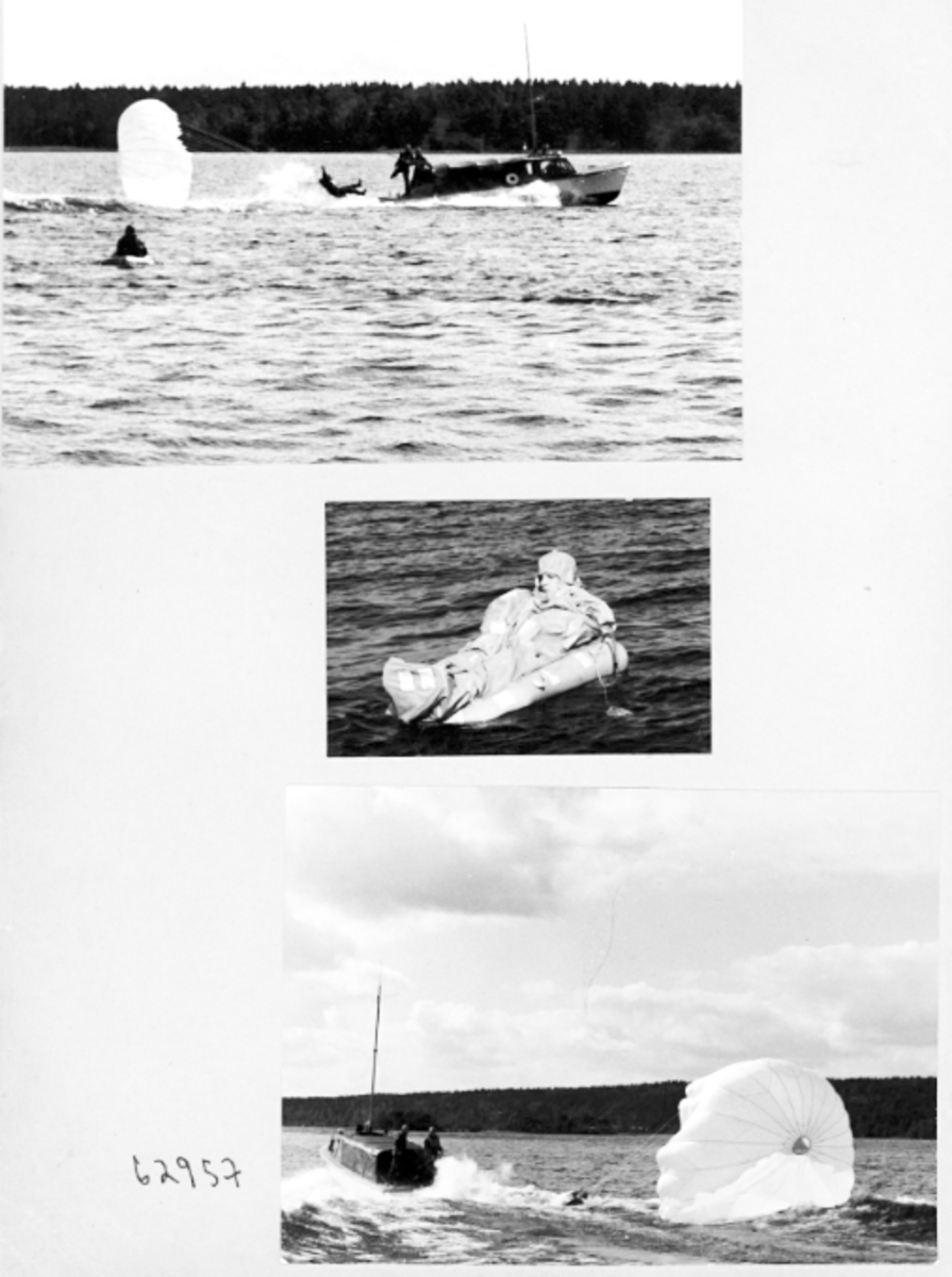 Titel: F6 Karlsborg 1964. Säkerhetsövning med isolerdräkt.
