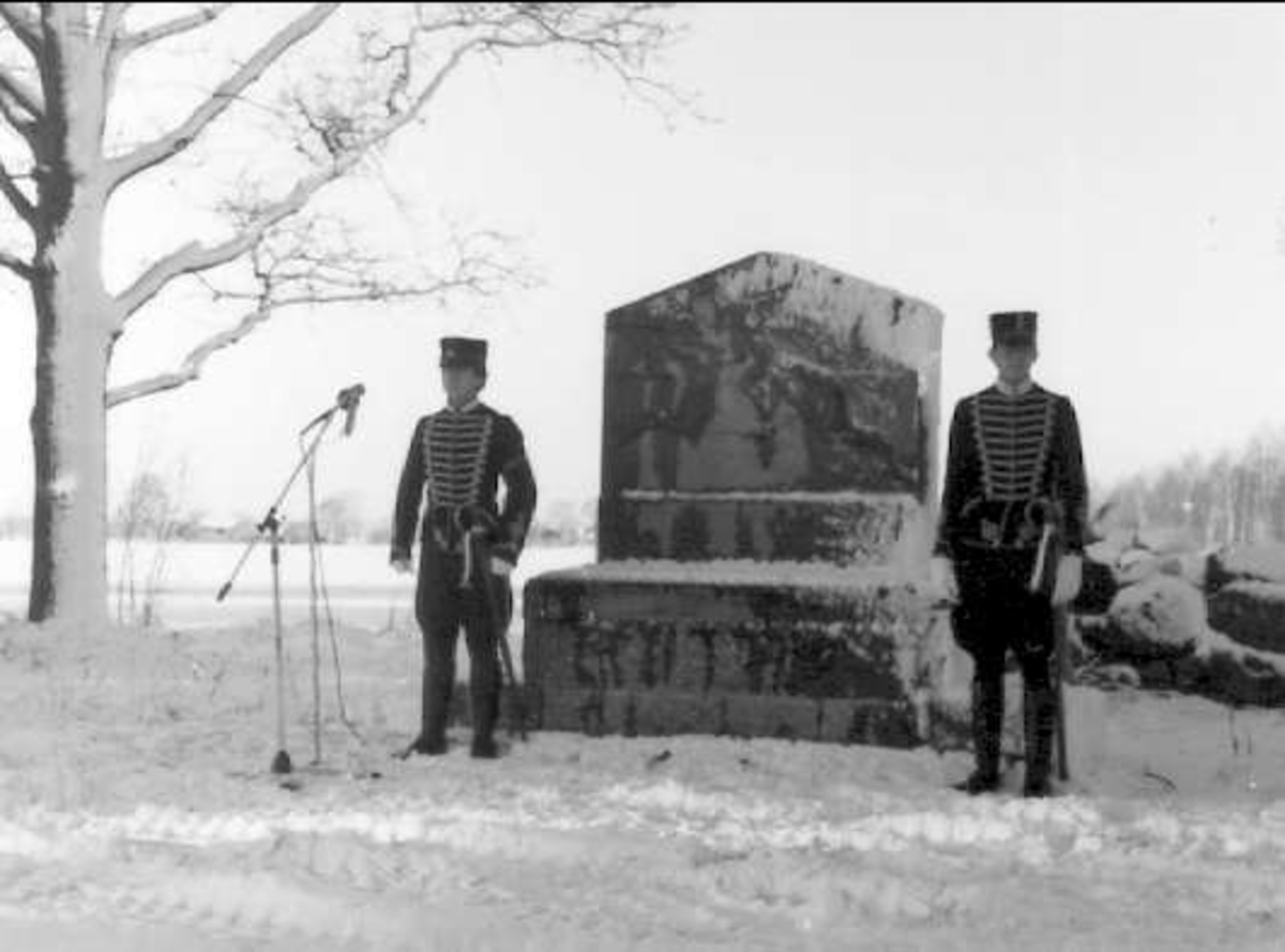 K 3:s minnessten på Sannahed. Två livhusarer som hedersvakt.