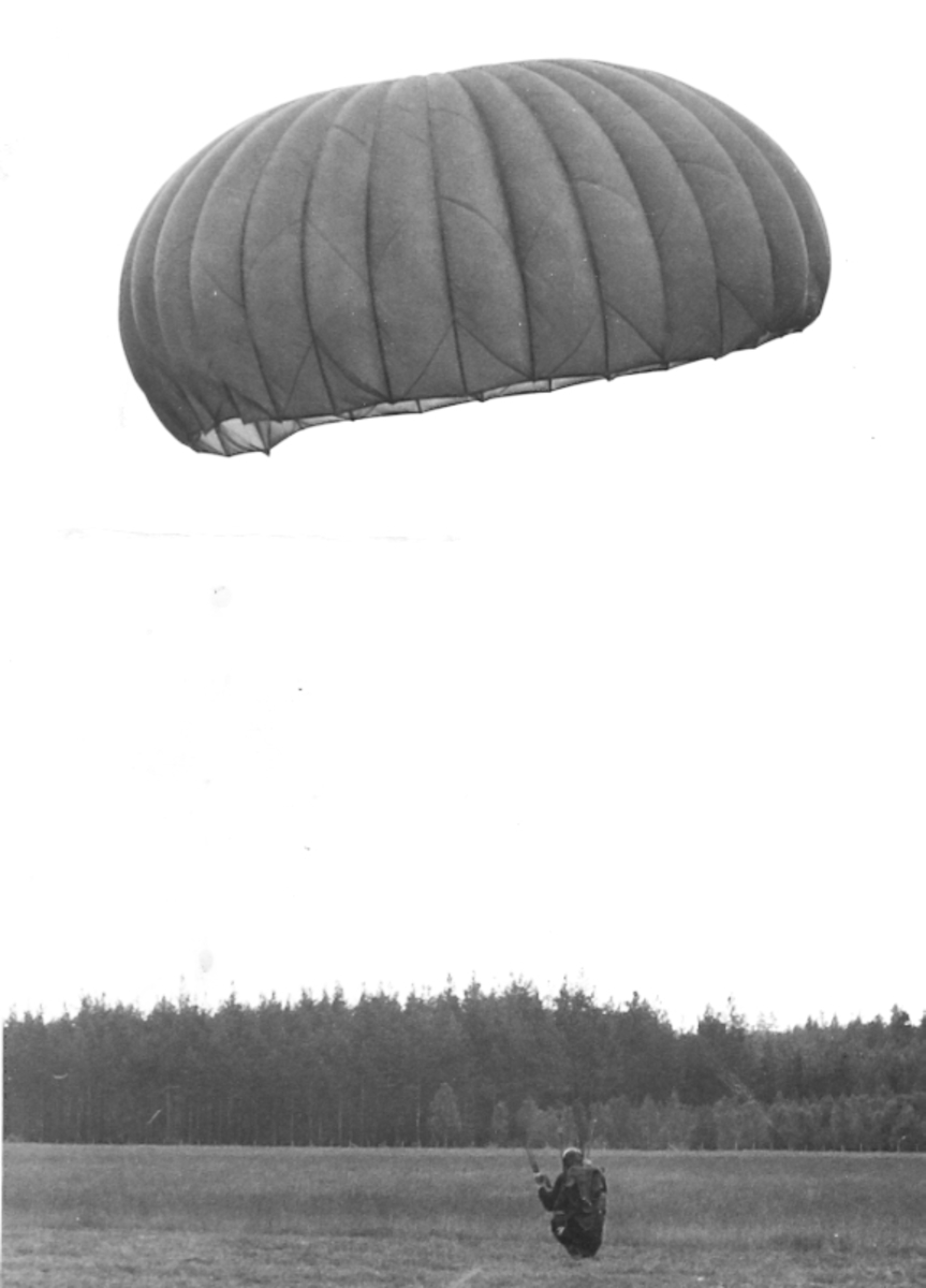 Titel: Fallskärmsjägarskolan Karlsborg i början av 1960-tal. Fallskärmshoppning.