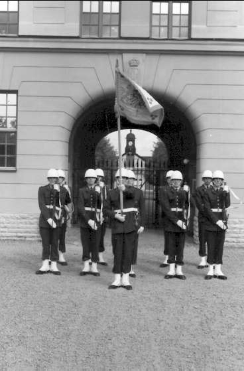 Livhusarernas standar med standarförare och standarvakt söder valvet K3 i Skövde.