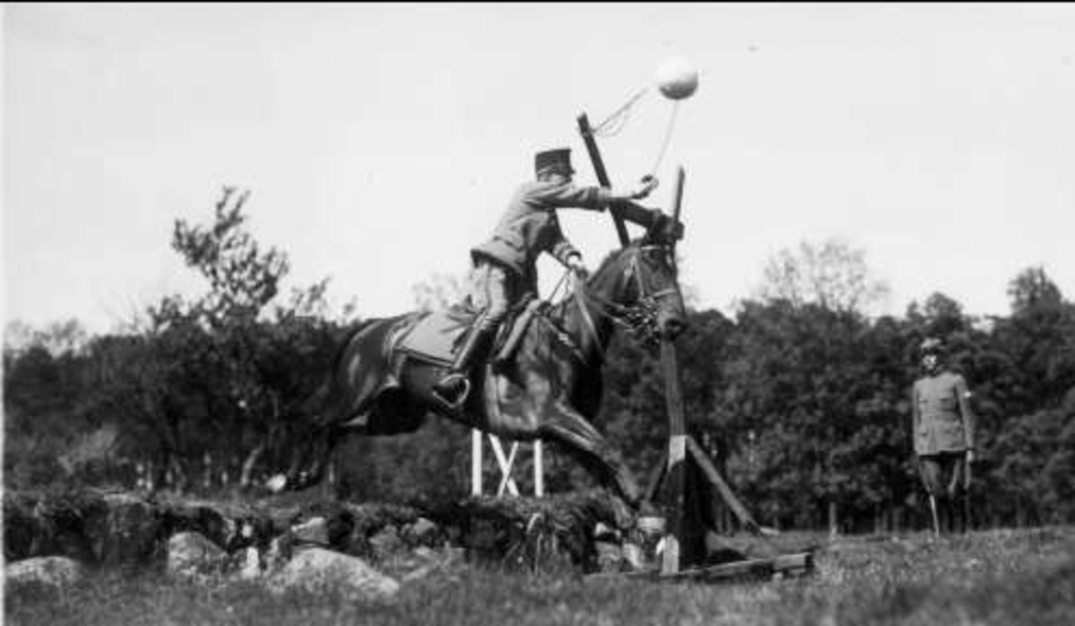 Sabelfäktning till häst. Antagligen på "Södra fältet".