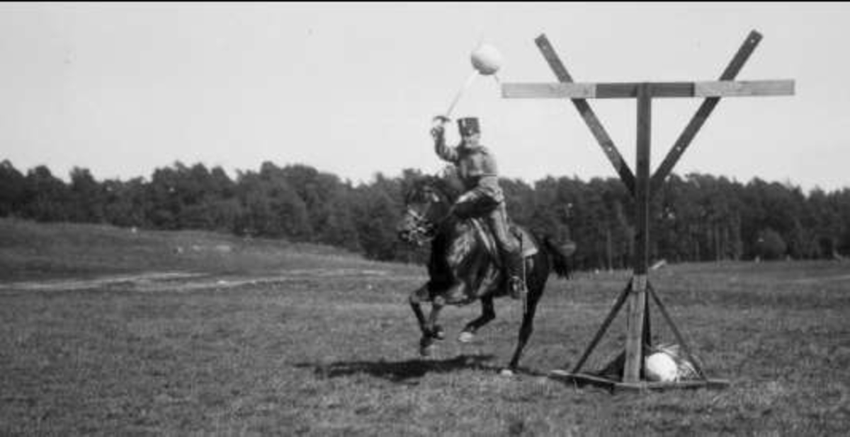 Sabelfäktning till häst på Södra fältet.