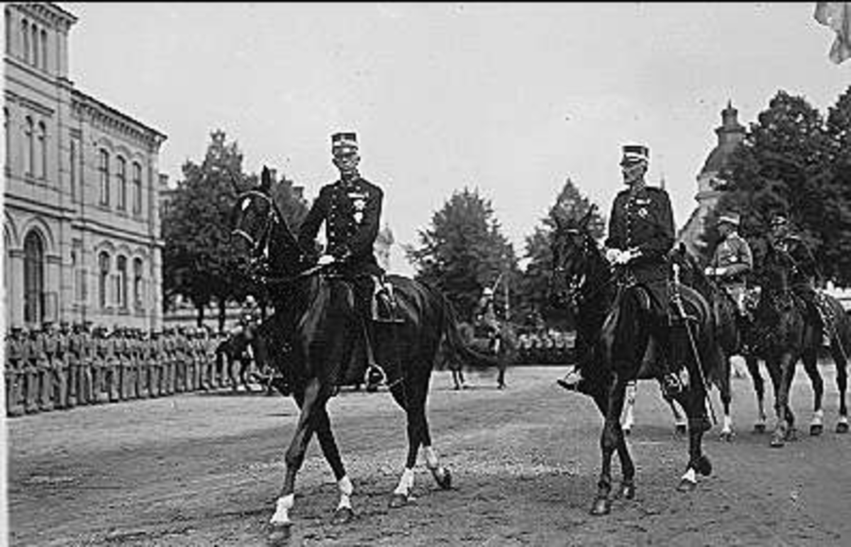 Konung Gustaf V på Königstiger framför Erik Ugglas skola i Skövde, åtföljd av kavalleriinspektören Prins Carl.