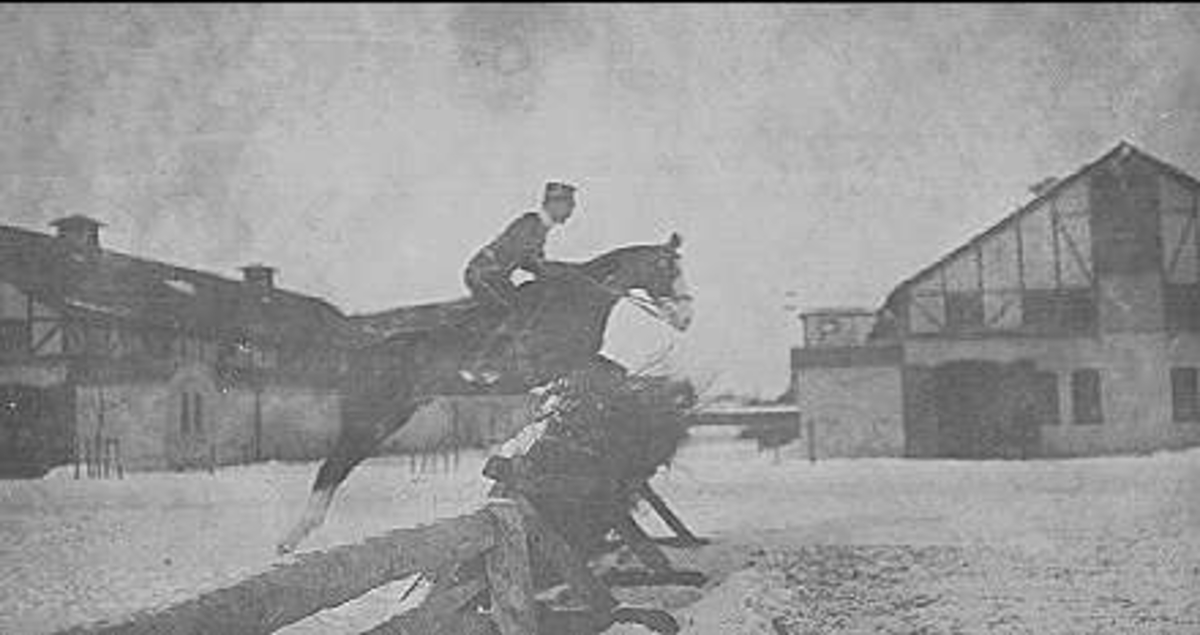 Ett flott språng över höck på K 3 kaserngård i Skövde. Ryttaren mycket korrekt och följsam sits.